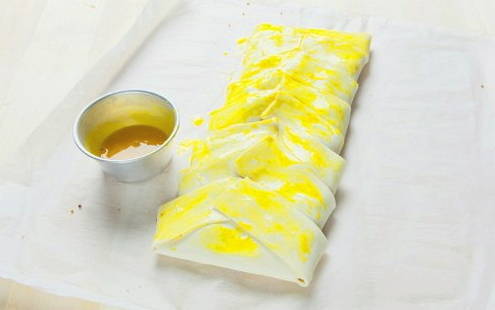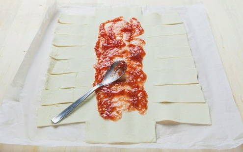 - Leg reepjes deeg op de vulling, die vervolgens worden ingevet met opgeklopte dooier.