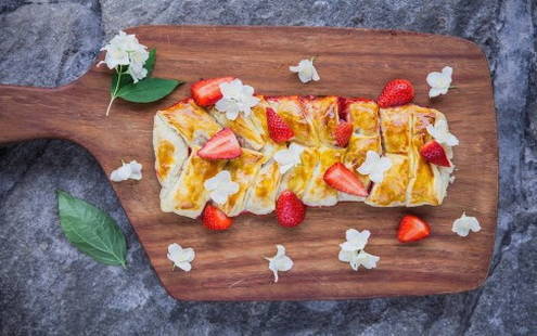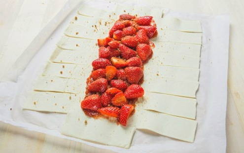 - Houd het bladerdeeg warm zodat het ontdooit en rol het uit tot een rechthoek, leg op perkamentpapier. Maak inkepingen aan de zijkanten van de rechthoek en verdeel aardbeienjam over het centrale deel van het deeg.