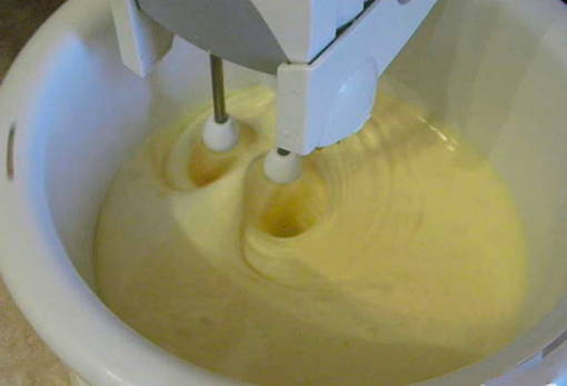 - Giet warme kefir in de massa en roer op hoge snelheid totdat de massa iets dikker wordt.