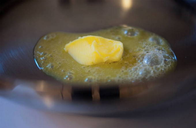 - Vul de boter in een aparte kom met kokend water totdat deze volledig is gesmolten. Voeg de gesmolten boter toe aan het deeg en meng alles opnieuw.