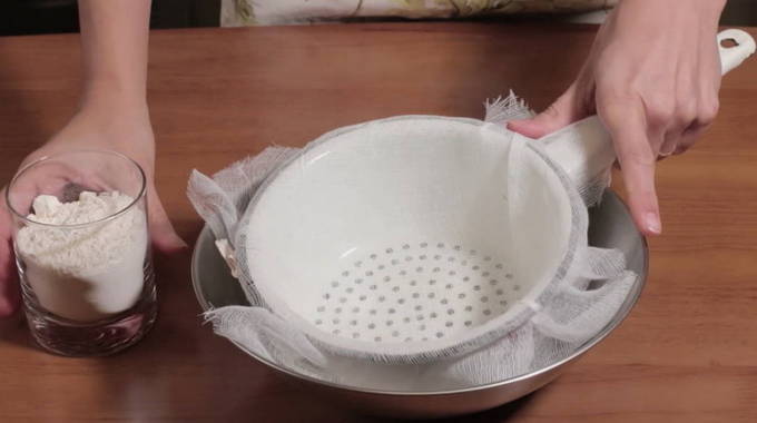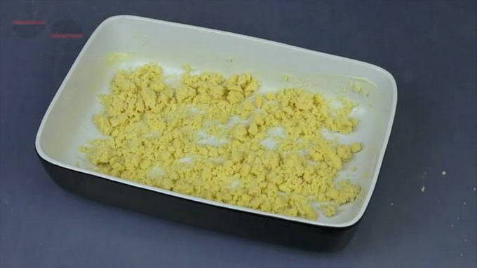 - Giet bloem gemengd met bakpoeder, kneed het deeg, zet het een half uur in de kou.