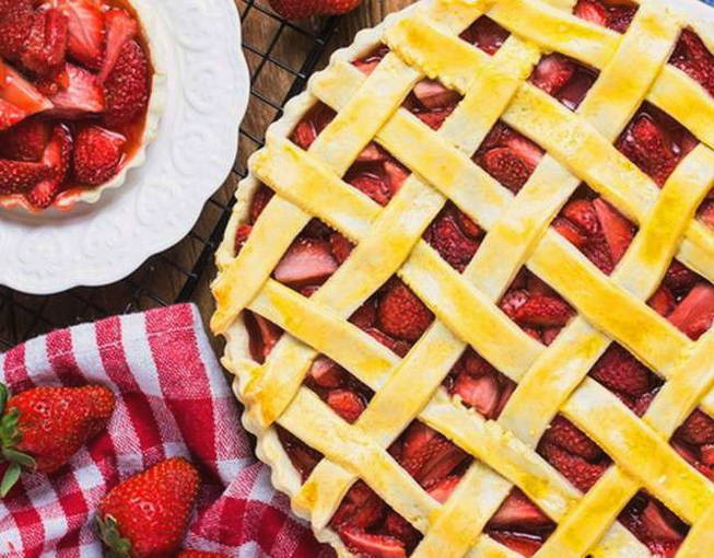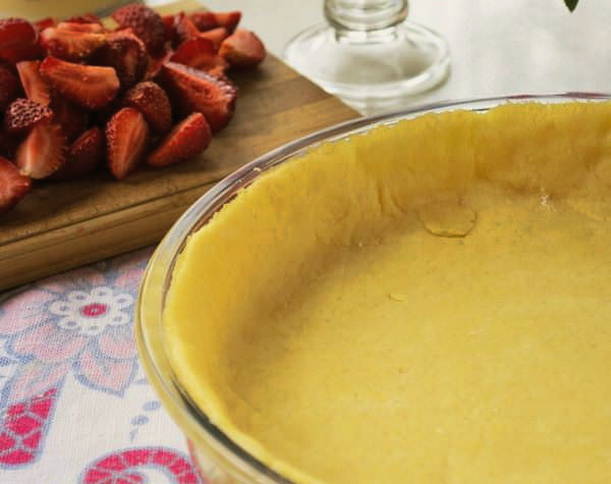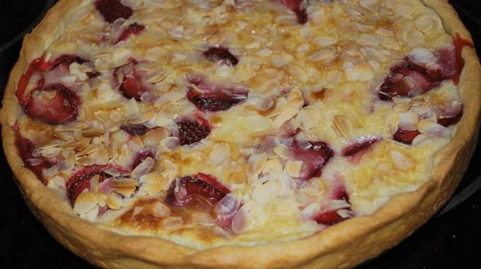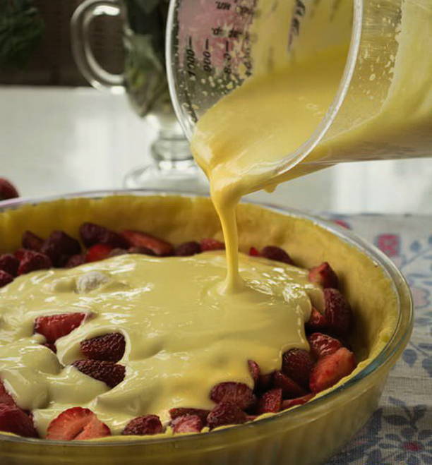 Vet een uitneembare ovenschaal in met boter, rol het deeg uit en vorm een bodem met zijkanten. Prik met een vork het deeg over het hele oppervlak om te voorkomen dat het tijdens het bakken gaat zwellen. Leg stukjes aardbeien op de bodem van de vorm op het deeg, overgiet met een mengsel van zure room, eieren, suiker en zetmeel.