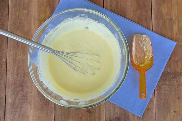 - Klop de zure room met eieren, vanille, suiker en bloem tot een gladde room.