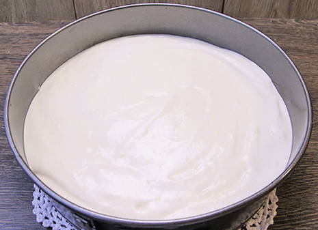 - Om de cake te gieten, meng je zure room, suiker, vanillesuiker en zure room. Klop met een mixer of klop tot de suiker is opgelost. Voeg bloem en zetmeel toe, meng opnieuw.