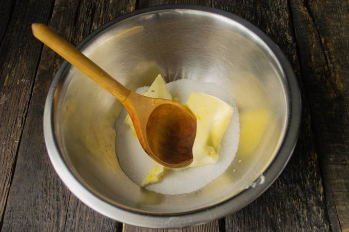 - Maal de zachte boter met suiker, giet de zure room erbij en klop goed.
