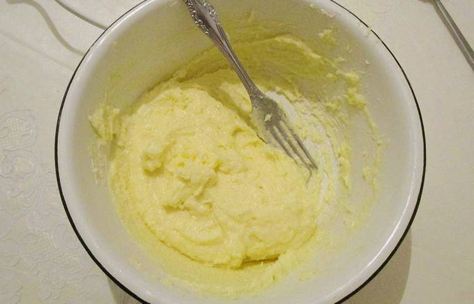 Maak de boter zacht, maal het met suiker, voeg bloem en bakpoeder toe, meng alles goed.
