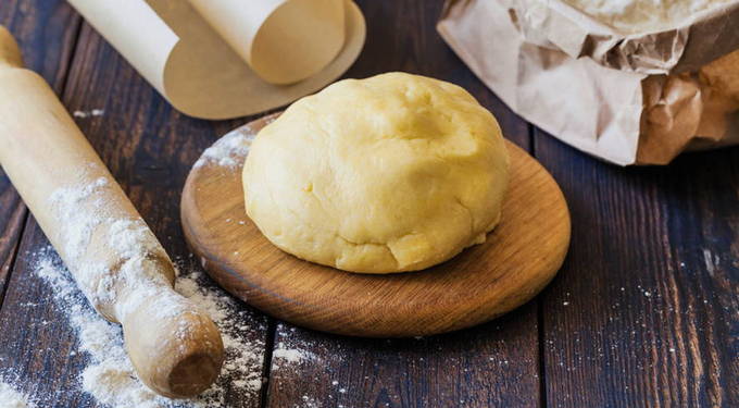 - Giet bloem gemengd met bakpoeder, kneed het deeg, zet het een half uur in de kou.