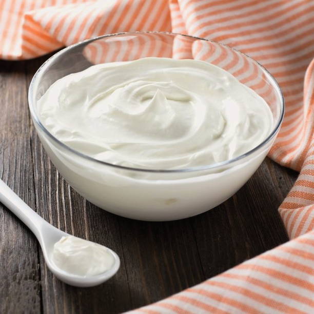 - Maal de zachte boter met suiker, giet de zure room erbij en klop goed.