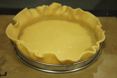 - Meng voor het deeg bloem met gehakte boter, voeg dan een ei en ijswater toe aan het midden, kneed goed. Wikkel het deeg in plasticfolie en leg het 15 minuten in de kou.