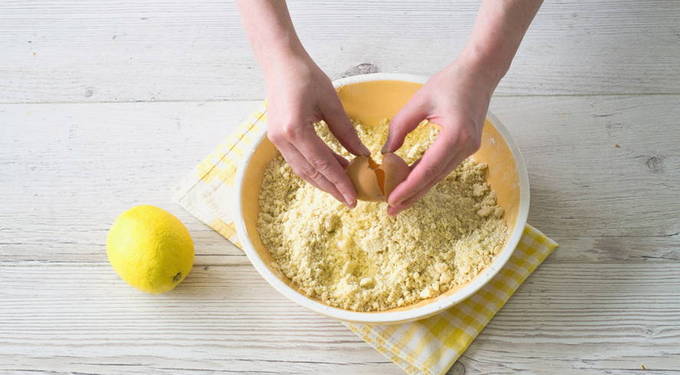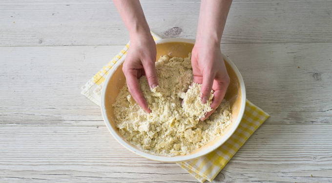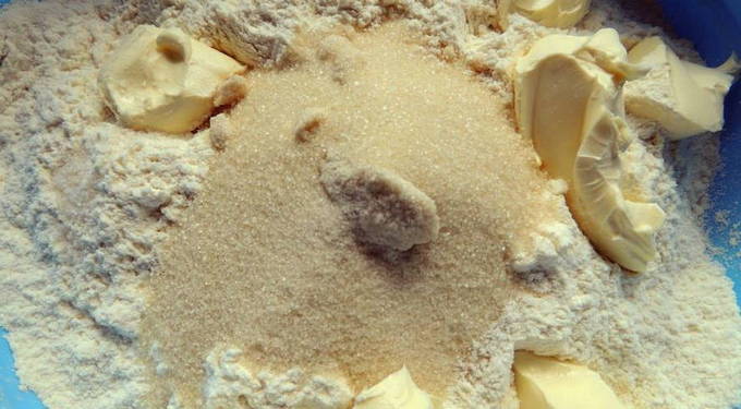 - Giet suiker in een kom met bloem, roer. Voeg vervolgens de boter toe en roer de ingrediënten met je handen tot er fijne kruimels ontstaan.