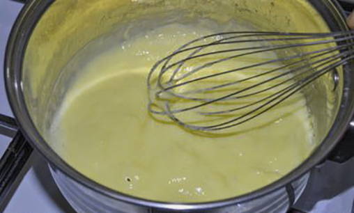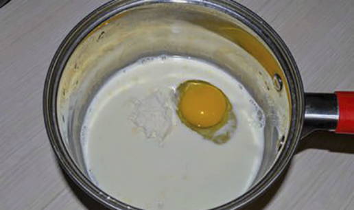 - Maak eerst een vla. Giet melk in een pan, voeg ei, suiker en bloem toe. Roer de ingrediënten tot een gladde massa.