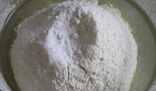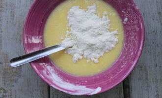 - Giet kefir in een kom, voeg suiker, zout en plantaardige olie toe. Combineer bloem met bakpoeder en zeef dit mengsel in een kom.