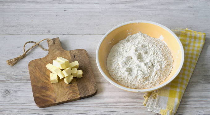 - Snijd de koude boter in blokjes. Zeef de bloem in een kom.