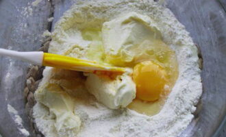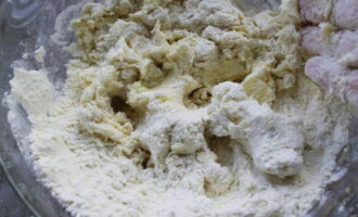 - Voeg 100 gram suiker, zout en zachte boter toe aan de gezeefde bloem, meng.