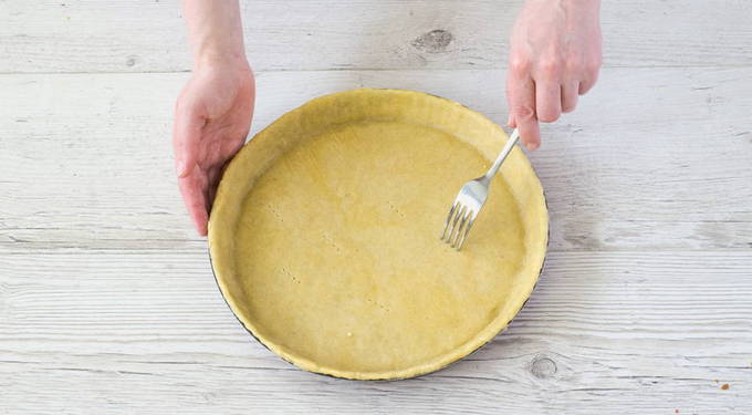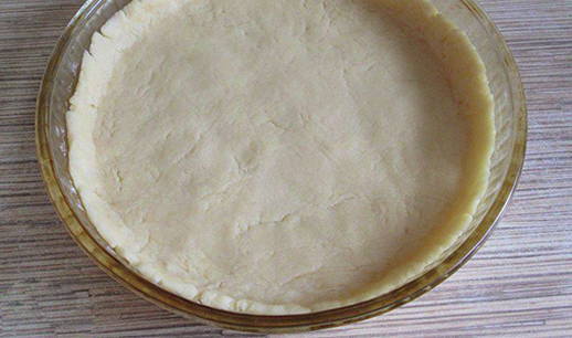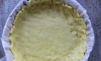 - Rol het gekoelde deeg in een dunne laag, breng het over in een ronde vorm zodat het de bodem en zijkanten bedekt. Speld de bodem op verschillende plaatsen vast met een vork. Zet de ovenschaal 15 minuten in de oven, voorverwarmd op 180 graden.