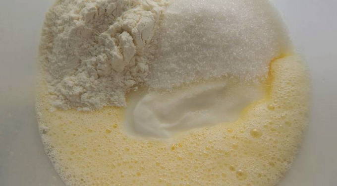 Voeg zure room en suiker toe aan de eiermassa, meng.