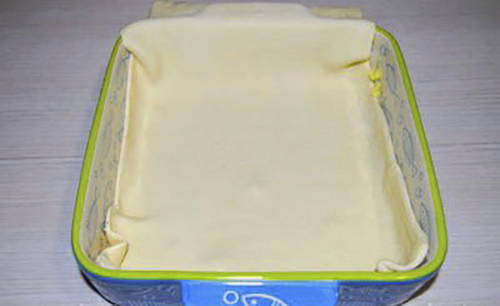 Rol het deeg uit tot een dunne laag, leg het dan in de vorm en maak kleine zijkanten.