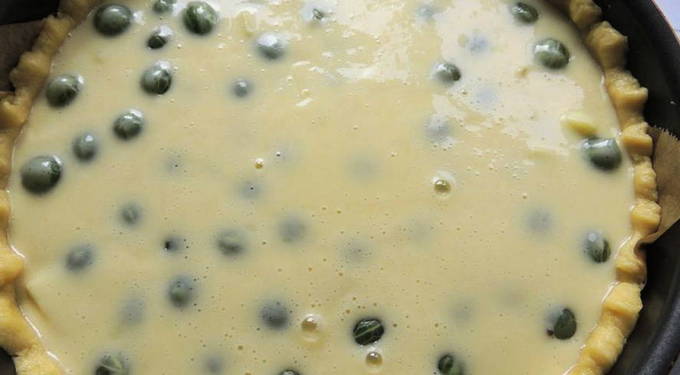 - Leg de custard op het deeg. Was en maal de kruisbessen in een blender. Leg de gehakte kruisbessen in de holtes in de custard.