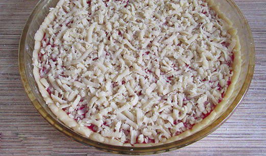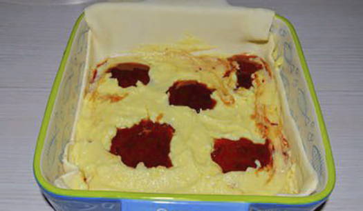 - Doe de bessenpuree op het deeg in een vorm. Rasp het tweede stuk deeg op een grove rasp direct boven de vulling.