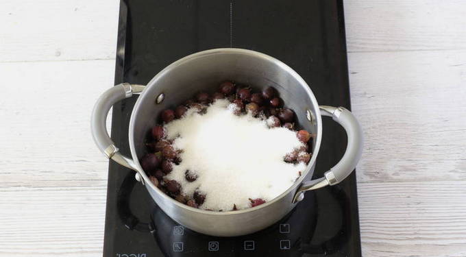 - Ontdooi de kruisbessen volledig, doe ze in een pan, voeg suiker toe en laat 10 minuten sudderen. Wrijf vervolgens de helft van de kruisbessen met de siroop door een zeef.