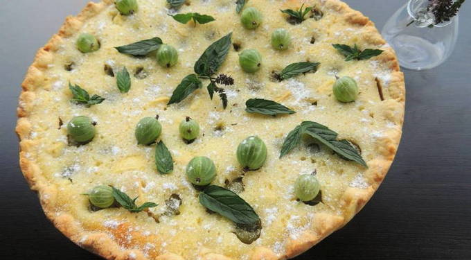 Het is onmogelijk om langs deze prachtige kruisbessentaart te gaan, het is gewoon een vuurwerk van smaak. Het is gemaakt van het meest delicate kruimeldeeg, rijpe bessen in een romige vulling.