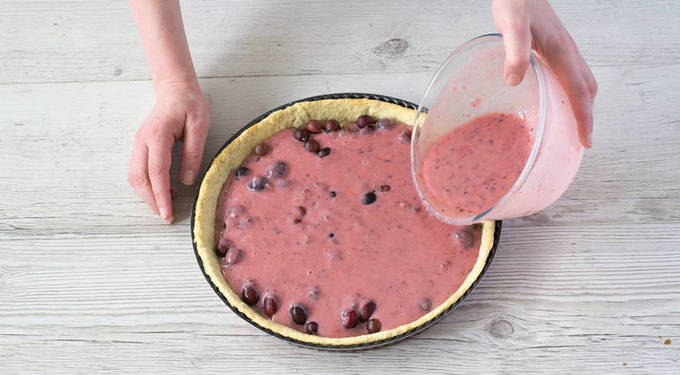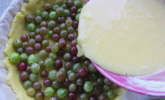 Leg de kruisbessen op het deeg. Giet de vulling over de bessen.