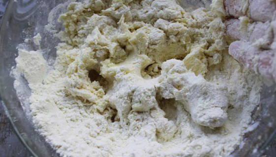 - Giet suiker in een kom met bloem, roer. Voeg vervolgens de boter toe en roer de ingrediënten met je handen tot er fijne kruimels ontstaan.