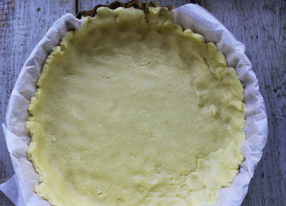 - Rol het grootste deel van het deeg uit, doe het in een vorm en maak zijkanten.