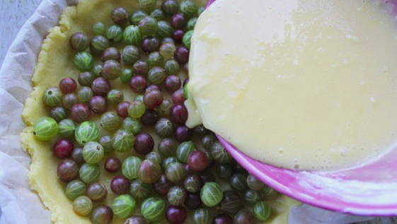 Leg de kruisbessen op het deeg. Giet de vulling over de bessen.