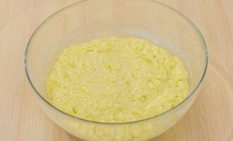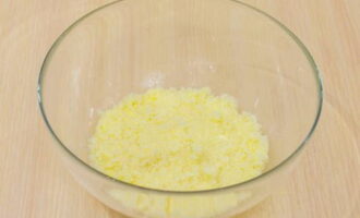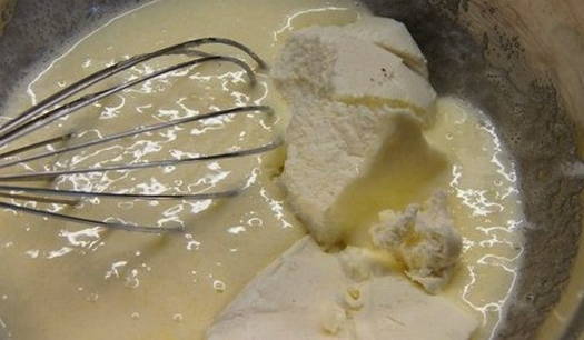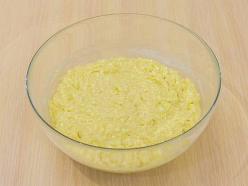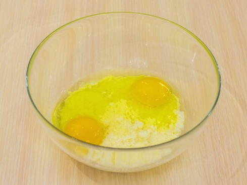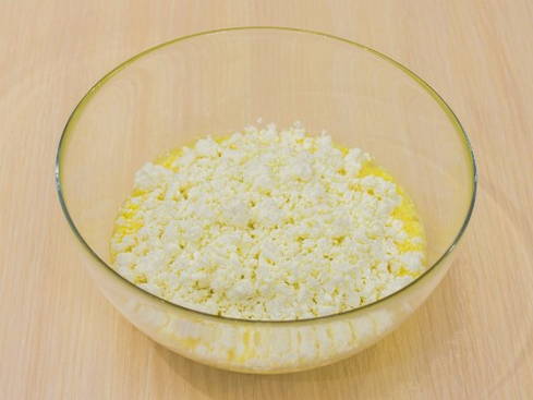 - Klop de dooiers met suiker en boter. Voeg vervolgens kwark en een snufje zout toe, roer tot een gladde massa.
