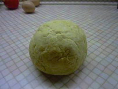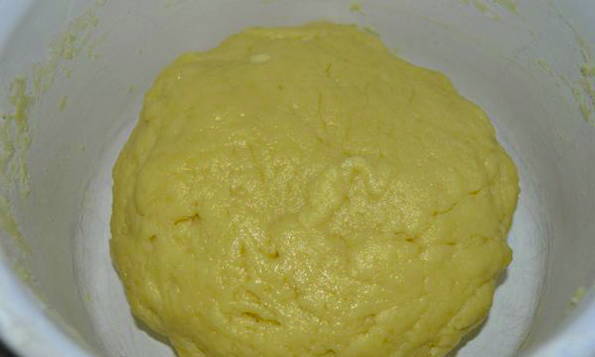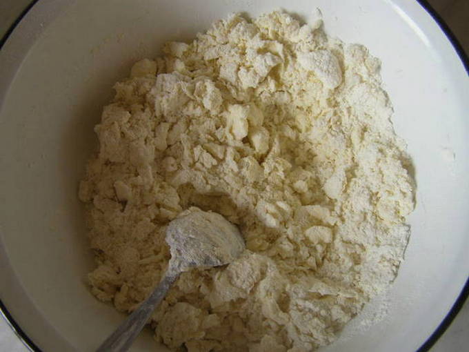 - Meng in een kom bloem, suiker, bakpoeder en een snufje zout. Verzachte margarine, in blokjes gesneden, toevoegen aan kom, roeren. Breek vervolgens twee eieren en kneed tot een niet te stijf deeg.