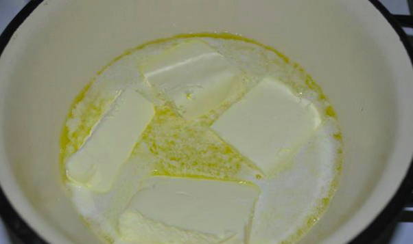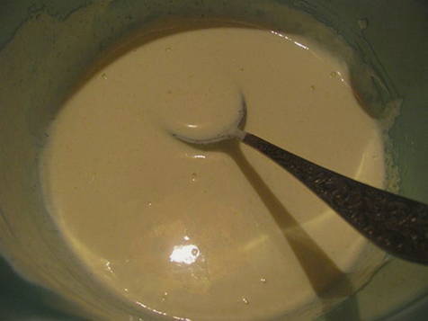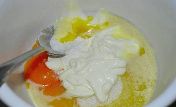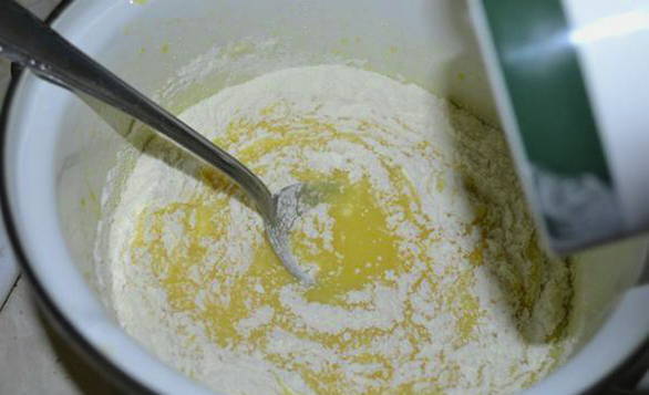 - Kneed het deeg. Meng in een kom gesmolten boter, 2 dooiers, zure room, 4 eetlepels suiker en bakpoeder.