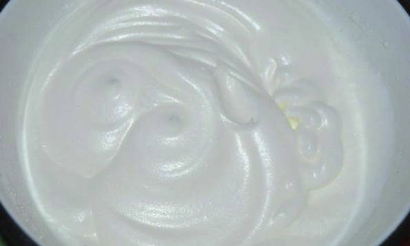 - Klop de blanken tot een dicht, dicht schuim. Voeg beetje bij beetje 3 eetlepels suiker toe en blijf kloppen.