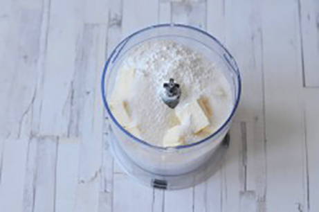 - Doe de boter, gezeefde bloem, suiker en bakpoeder in een blenderkom. Mix deze ingrediënten door elkaar.
