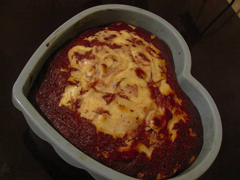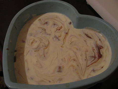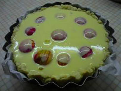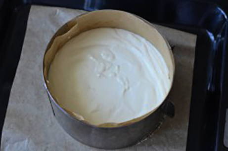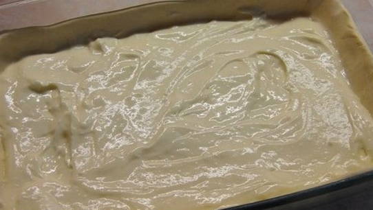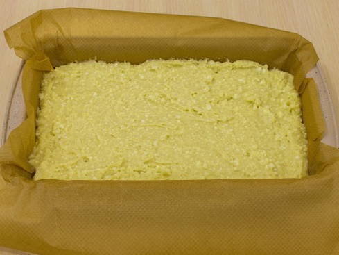 - Doe het deeg in een siliconenvorm, giet de wrongelvulling erop, druk het plat met een lepel.