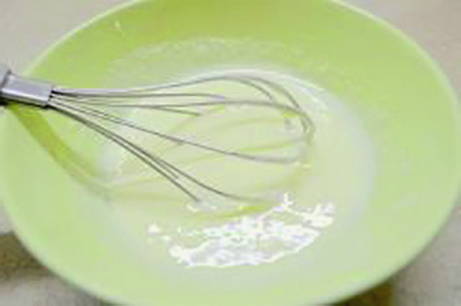 Breek twee eieren in een kom, roer tot een gladde massa.