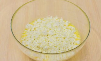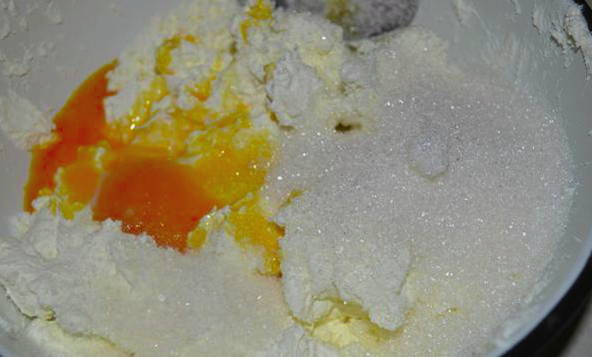 - Klop de kwark met een blender, voeg twee dooiers, 120 gram gewone suiker en vanillesuiker toe, meng.
