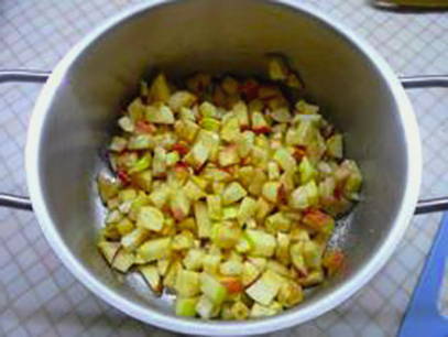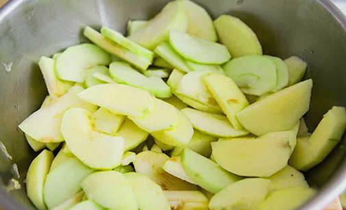 - Was de appels, schil en zaden, snijd ze in plakjes. Doe de appels in een pan met dikke bodem, voeg het sap van een halve citroen, suiker en een beetje water toe en laat op laag vuur half gaar sudderen.