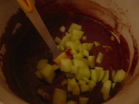 - Snijd de appels in kleine blokjes en roer door het deeg.