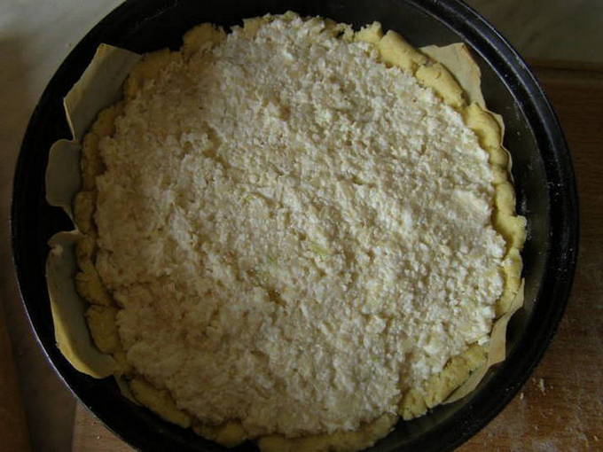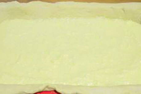 - Rol het bladerdeeg uit tot een laag van 3-4 millimeter dik, leg het in een hittebestendige vorm. Giet de wrongelvulling op het deeg.