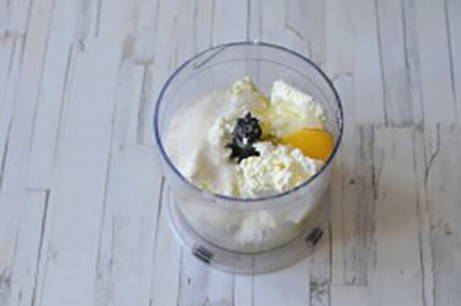 - Klop voor de vulling de kwark, zure room, ei en suiker met een mixer.