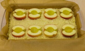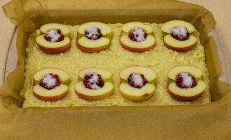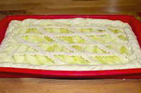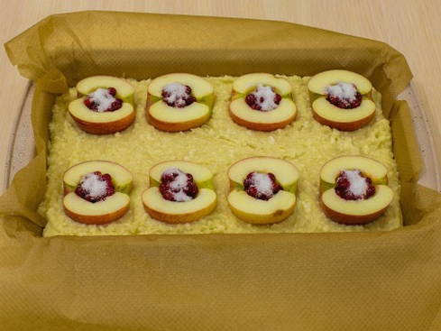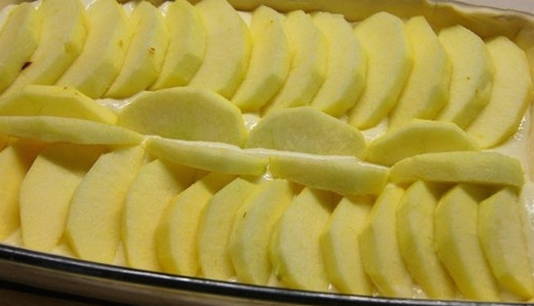 - Leg de appelschijfjes op de wrongelvulling, druk ze een beetje in de vulling.