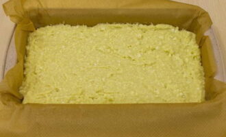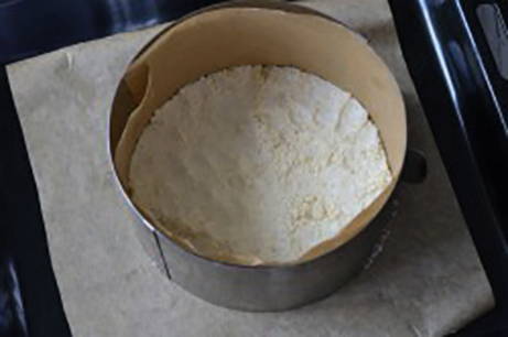 - Bedek het formulier met perkament. Giet 1/3 van de zandkruimels in de bodem van de vorm en druk deze een beetje aan.
