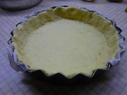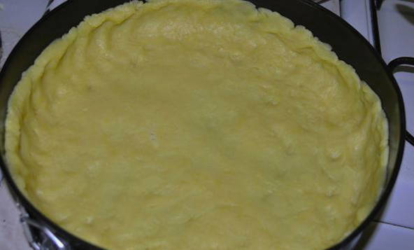 - Haal het deeg uit de koelkast en rol het uit. Vet de vorm in met boter, leg het deeg erin en strijk het glad met je handen, vorm de zijkanten. Plaats de vorm met het deeg 10 minuten in een voorverwarmde oven op 180 graden.