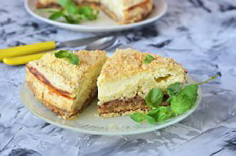 Van deze kwark en appeltaart zal je helemaal blij zijn. Het deeg heeft een delicate smeltende textuur en het oppervlak is bedekt met een gewichtloze, knapperige meringue.