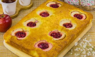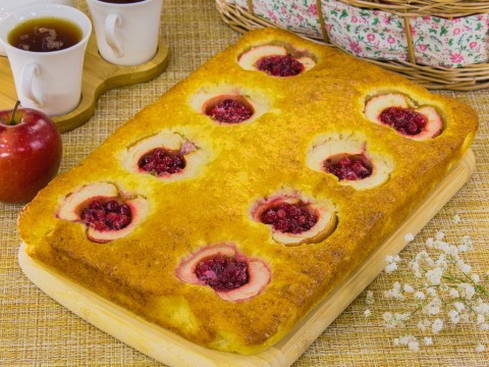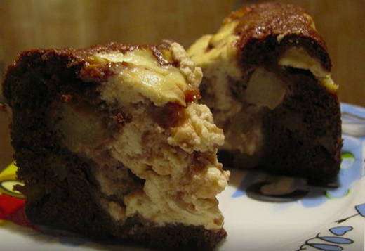 Een taart met veel vulling en weinig deeg. De rest is sappig, zacht en aromatisch gebak. Dankzij de wrongel smelt de taart gewoon in je mond, en de appels geven hem een heerlijk aroma.