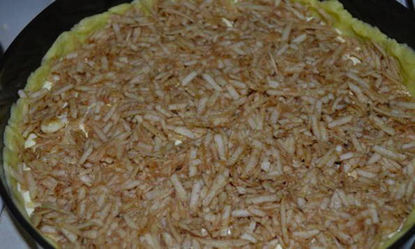 - Rol ook het tweede deel van het deeg uit, leg het op de vulling, prik het in met een vork. Bevestig de randen van de onderste en bovenste lagen van het deeg aan elkaar.