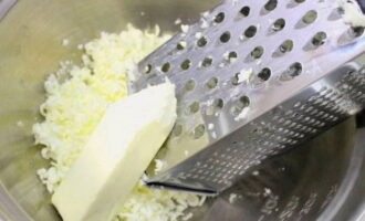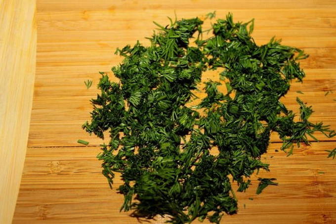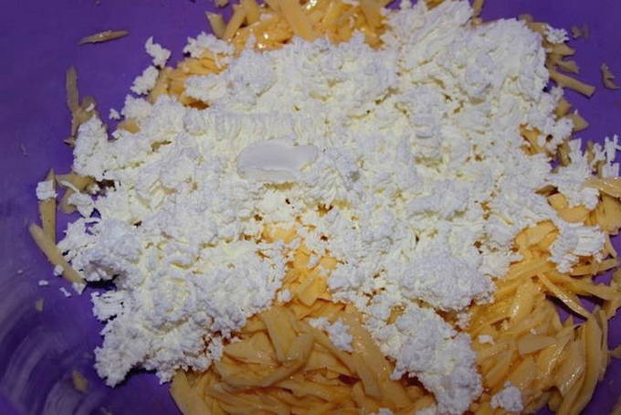 - De geraspte kwark, gehakte dille en knoflook worden aan de massa toegevoegd.