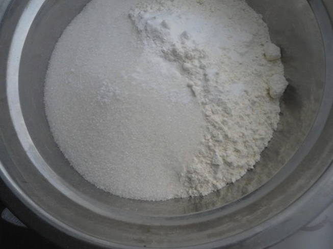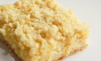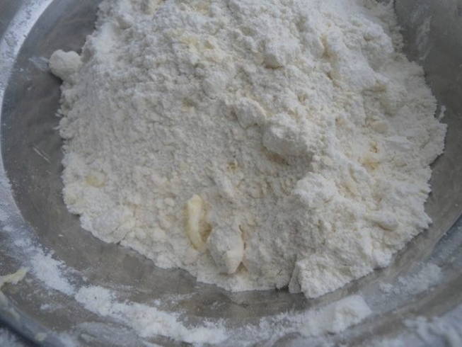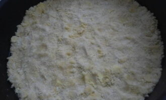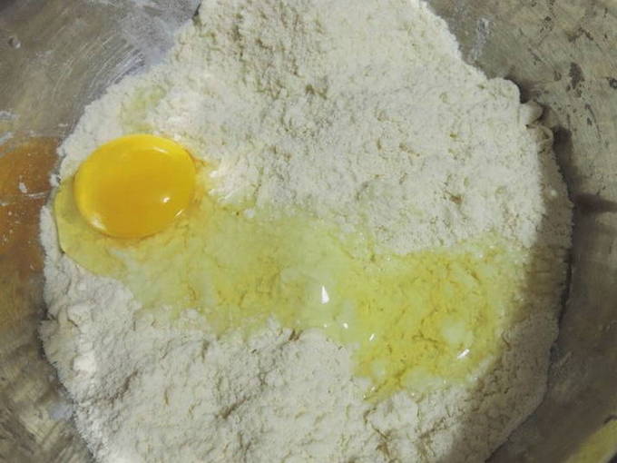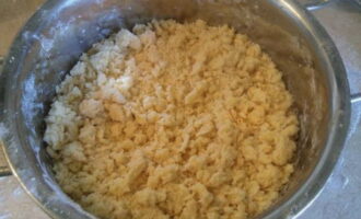 - Maal de bloem met licht zachte boter en suiker tot een kruimel van het deeg. Bakpoeder wordt toegevoegd en de massa wordt opnieuw gemalen.