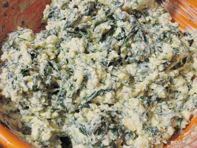 - Meng spinazie, kwark, gehakte peterselie, zure room en ongeveer 100 gr. kaas schaafsel. Je kunt een beetje zout toevoegen, maar houd er rekening mee dat de kaas al zout is.